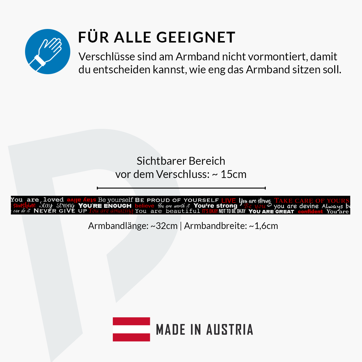 Hergestellt in Österreich, bieten unsere Stoffarmbänder mit Motivationssprüchen eine hohe Qualität und Langlebigkeit. Du kannst dir sicher sein, dass dein Stoffarmband schwarz jahrelang hält und dich stets an deine Affirmation Zitate erinnert. Ein individuelles Armband, das dir nicht nur gut steht, sondern auch eine tiefere Bedeutung hat!