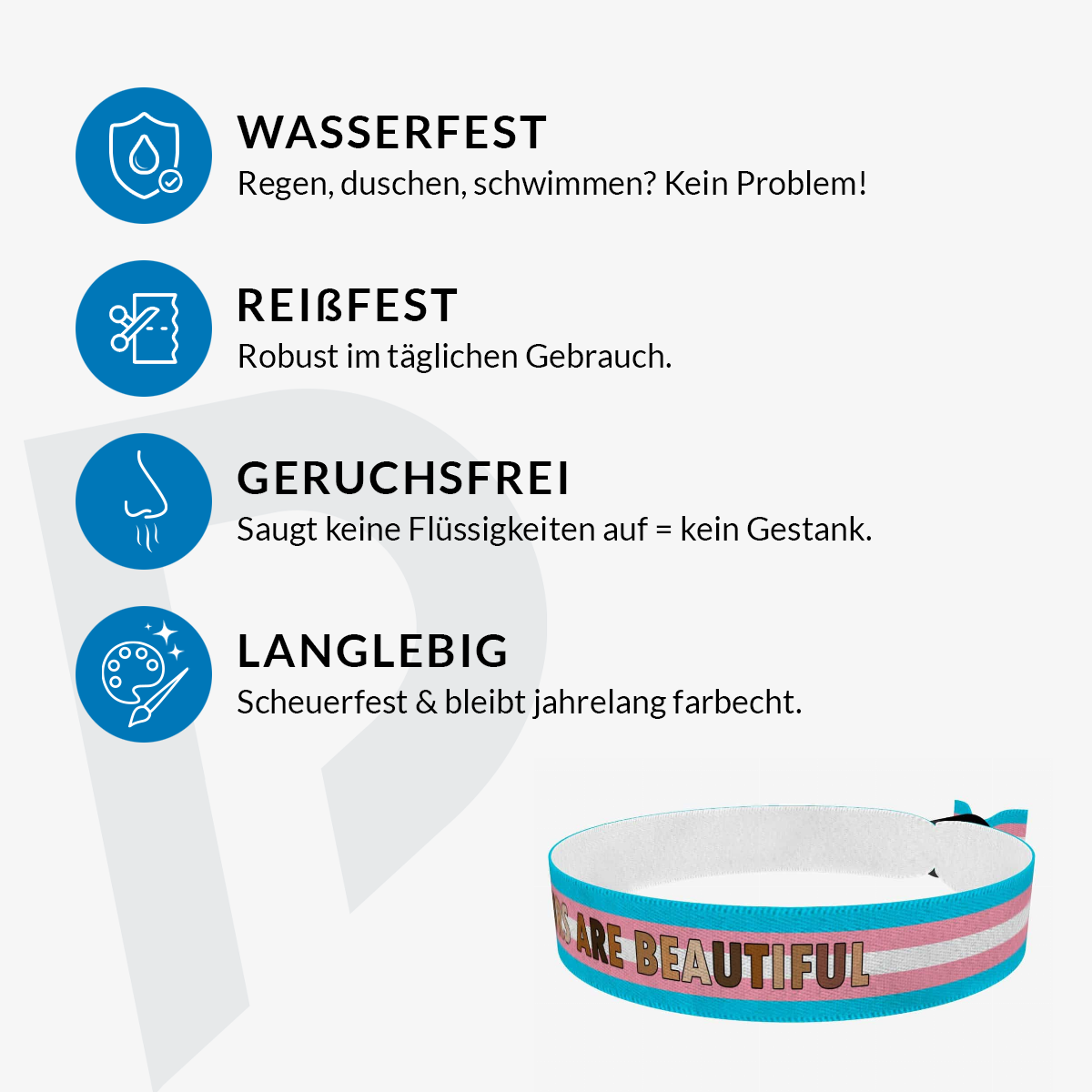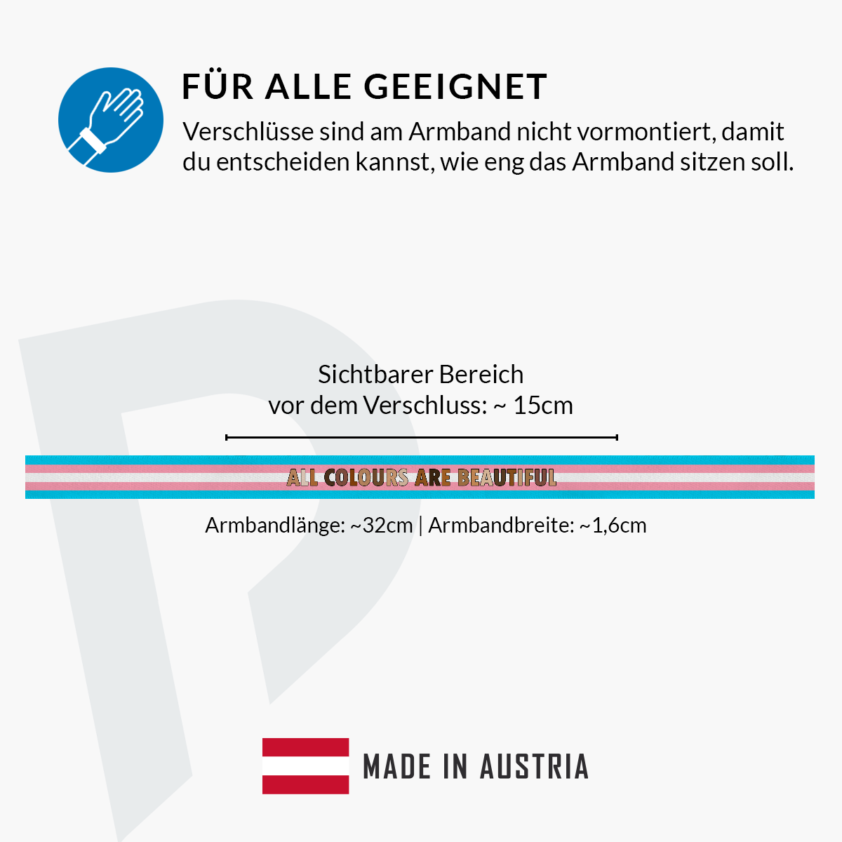 Das All colours are beautiful Transgender Stoffarmband ist nicht nur ein Stoffarmband, sondern ein echtes Statement Armband für Vielfalt und Akzeptanz! Hergestellt in Österreich, überzeugt es durch höchste Qualität und ein farbenfrohes, detailreiches Design, das jahrelang hält. Trage ein Stück tragbare Kunst und zeige deine Unterstützung für die Transgender-Community!