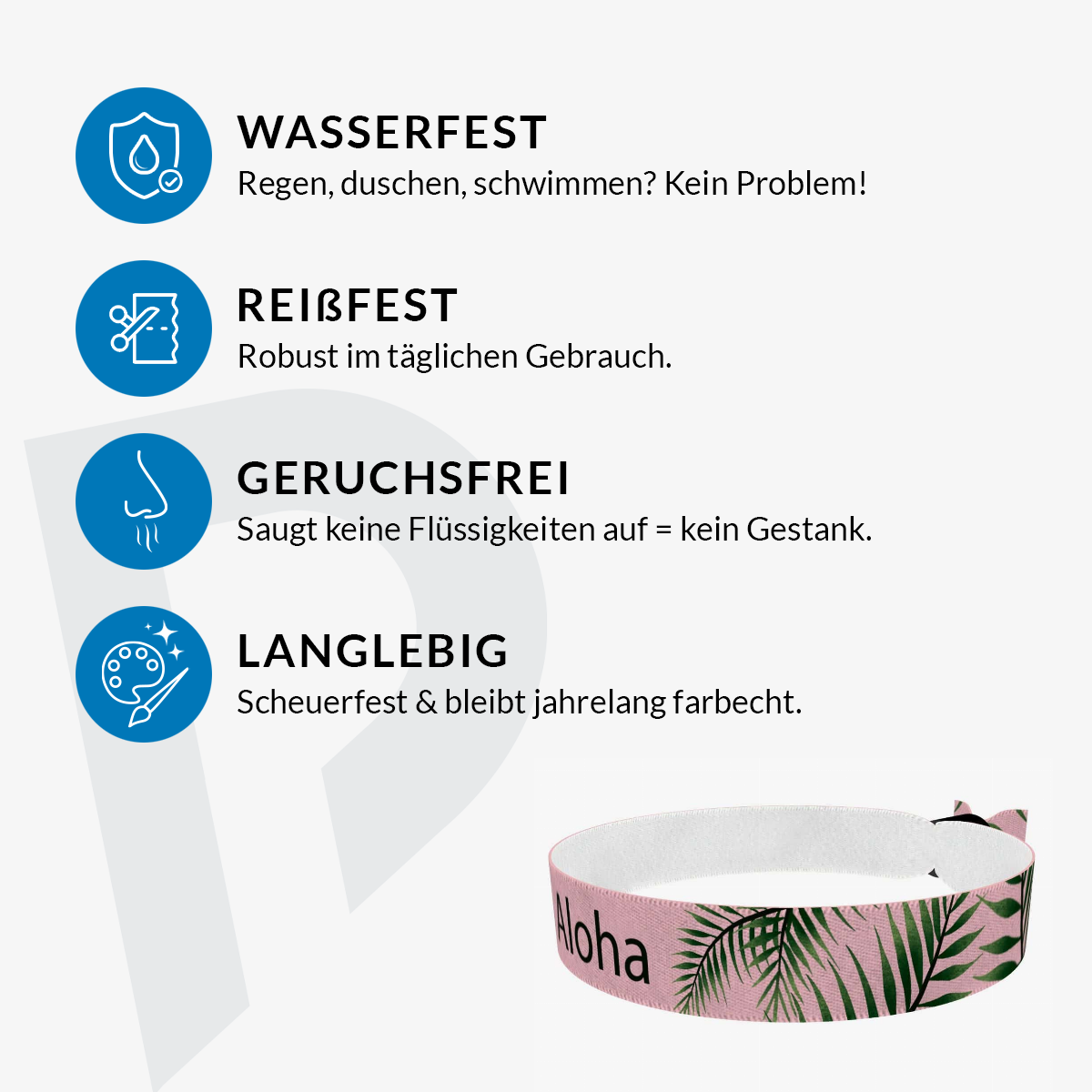 Unsere bedruckten Stoffarmbänder sind dünner & qualitativer als übliche Festivalbänder! Sie sind wasser-, reiss- & abriebfest und werden von uns in Handarbeit produziert!