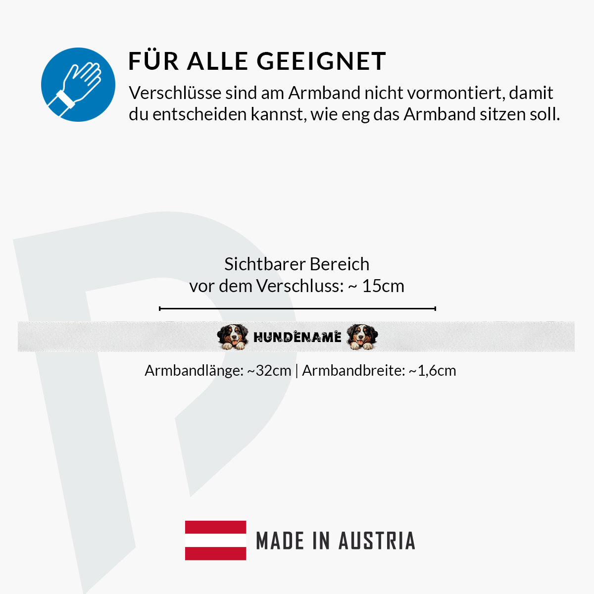 Entdecke das perfekte Accessoire für alle Hundeliebhaber – unser Appenzeller Sennenhund Stoffarmband anpassbar mit Name! Trage deinen Hund immer am Handgelenk und halte die tierische Freundschaft lebendig. Dieses schöne Erinnerungsarmband für Hunde ist nicht nur modisch, sondern auch ein individuelles Hundearmband, das in Handarbeit in Österreich hergestellt wird. Jedes Stoffarmband ist von hoher Qualität, jahrelang haltbar und wasser- sowie abriebfest – perfekt für aktive Hundebesitzer!