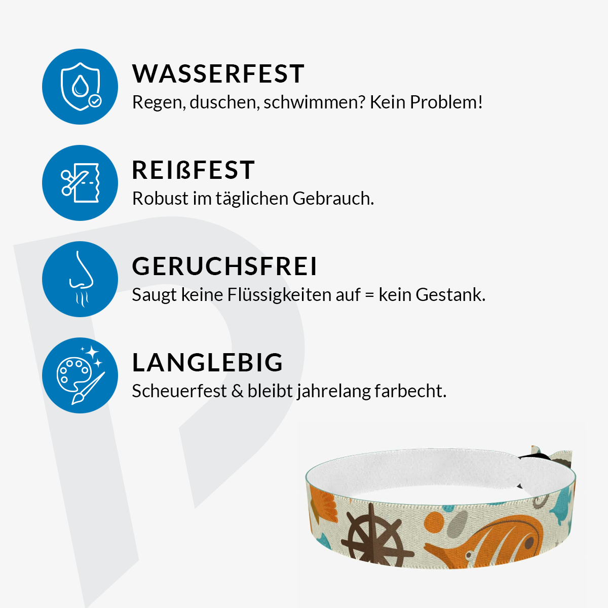 Unsere bedruckten Stoffarmbänder sind dünner & qualitativer als übliche Festivalbänder! Sie sind wasser-, reiss- & abriebfest und werden von uns in Handarbeit produziert!