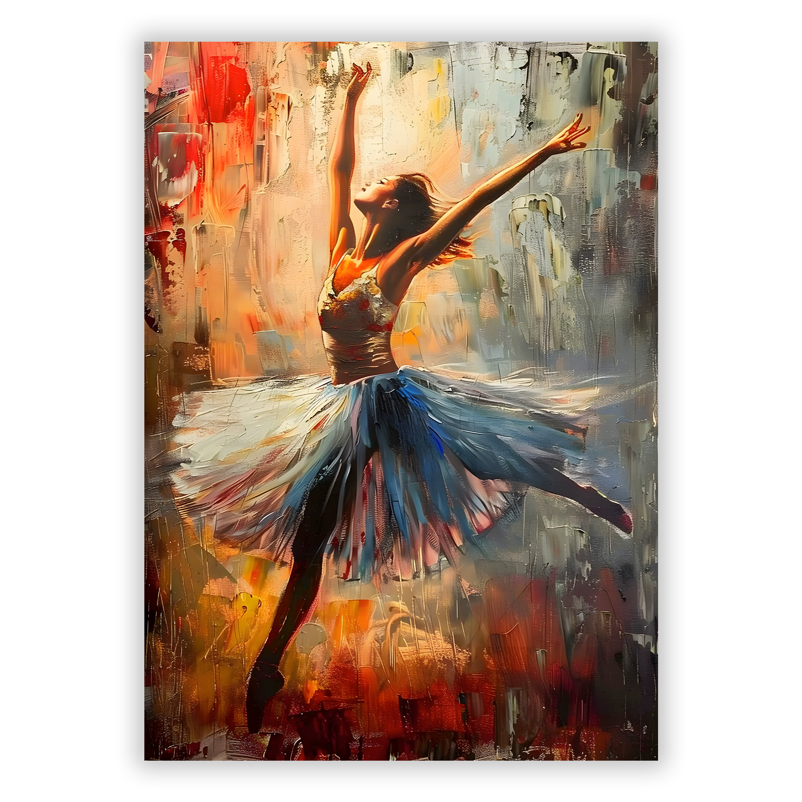 Dein Ballerina Poster: du erhältst ein dynamisches und farbenfrohes Poster, das eine tanzende Ballerina in den Mittelpunkt stellt. Umgeben von lebhaften Farbverläufen in warmen und kühlen Tönen zieht dieses Kunstwerk alle Blicke auf sich. Durch den modernen Stil bietet es einen perfekten Akzent für kreative Räume und Tanzstudios. Ob im Wohnzimmer, Schlafzimmer oder Büro – dieses Poster verwandelt jede Wand in einen inspirierenden Blickfang.