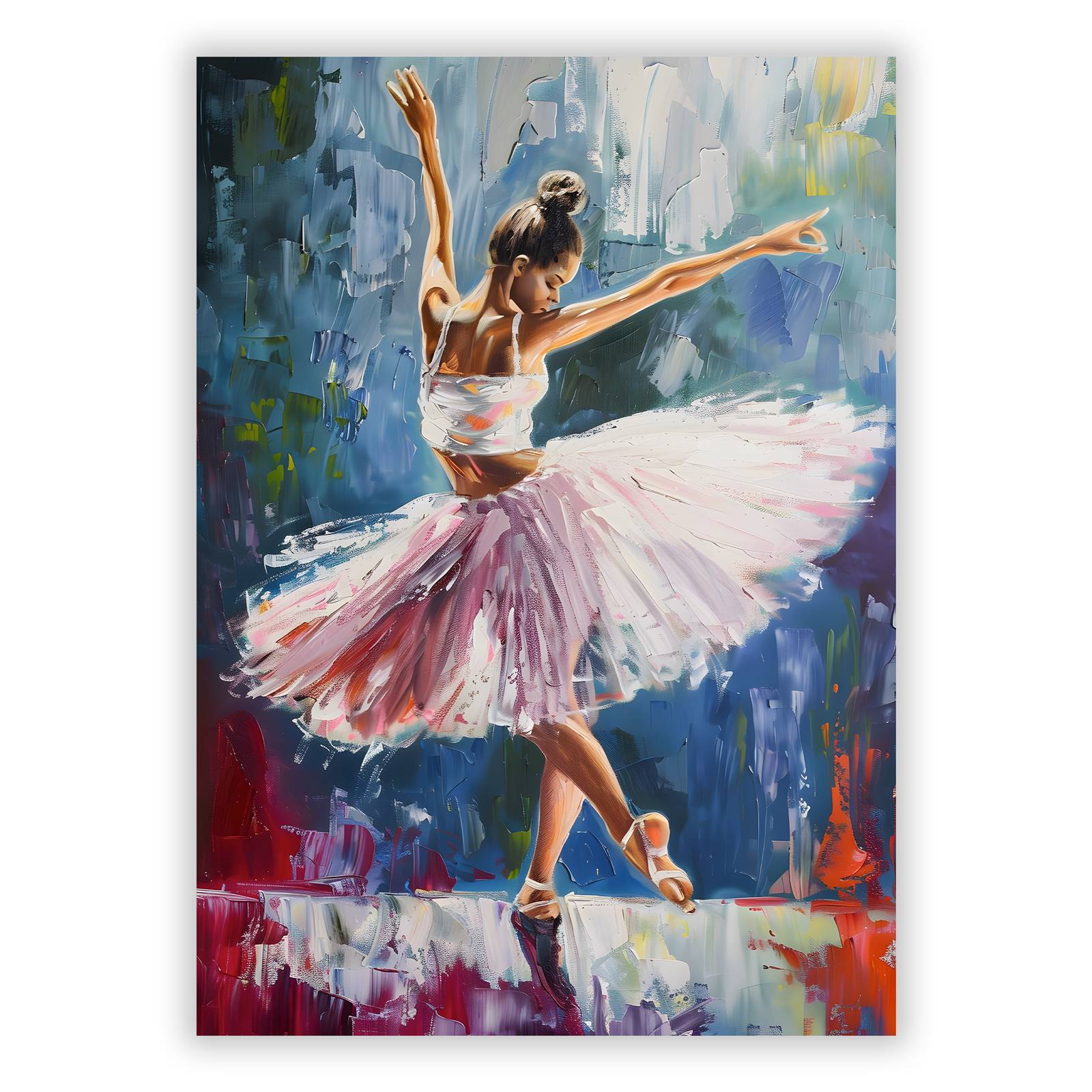 Dieses farbenfrohe Poster zeigt eine tanzende Ballerina, umgeben von lebhaften Farbverläufen, die das Auge sofort fesseln. Es ist der perfekte Ausdruck von Tanzkunst und Ballett, und wird garantiert zum Blickfang in jedem Raum. Die hochwertige Verarbeitung und das semimatte 195 g/m² Papier sorgen dafür, dass dein Poster lange schön bleibt und nicht verblasst.