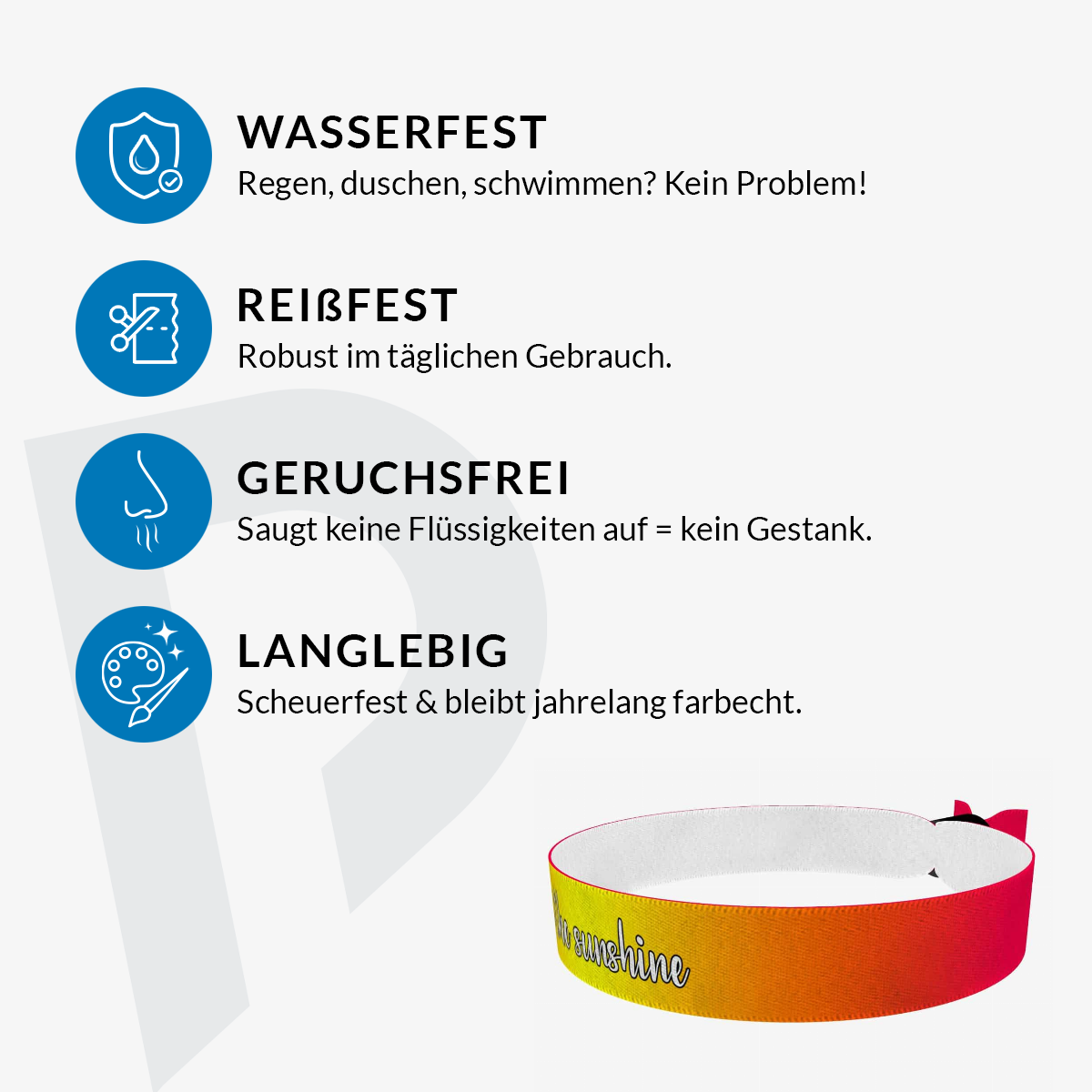 Unsere bedruckten Stoffarmbänder sind dünner & qualitativer als übliche Festivalbänder! Sie sind wasser-, reiss- & abriebfest und werden von uns in Handarbeit produziert!