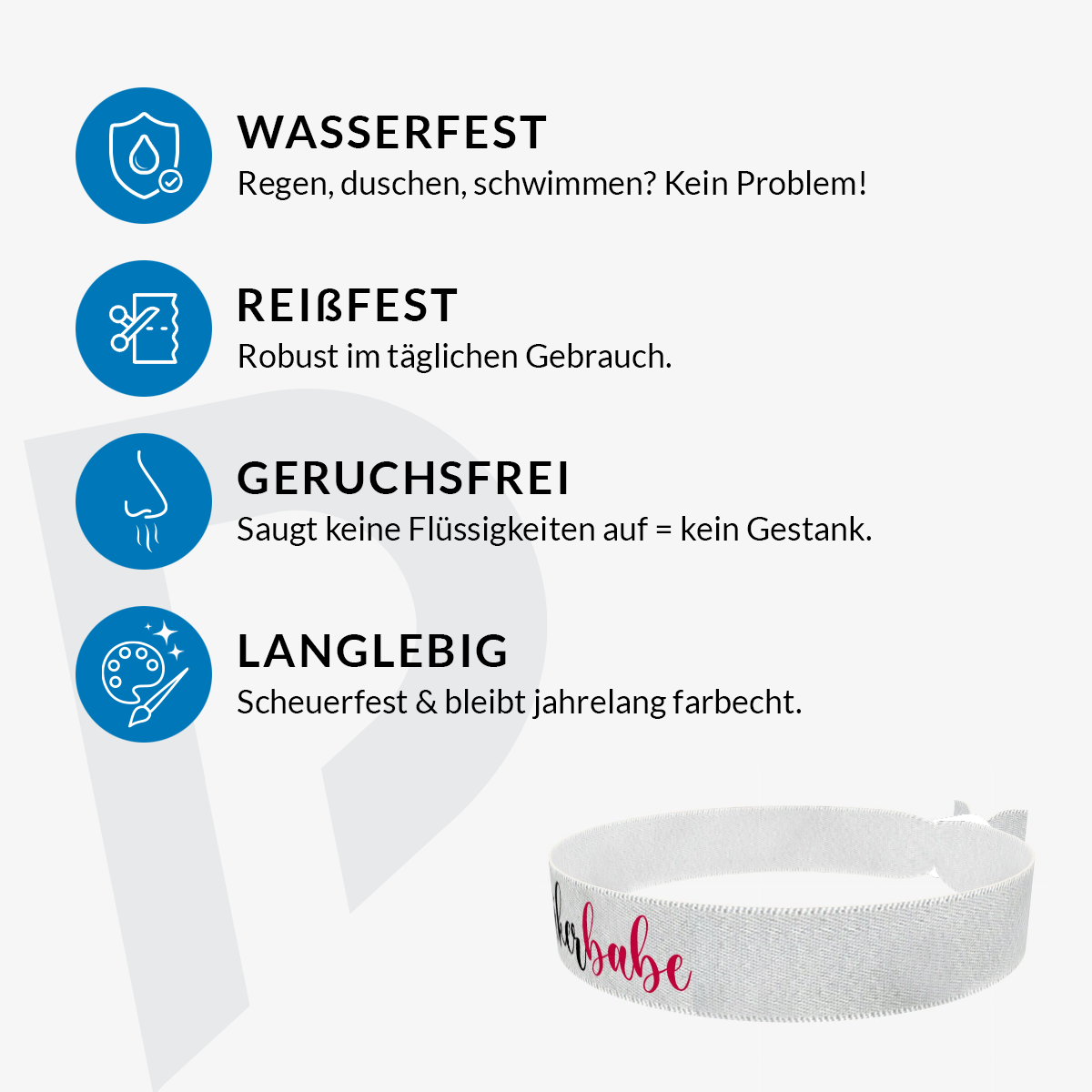 Unsere bedruckten Stoffarmbänder sind dünner & qualitativer als übliche Festivalbänder! Sie sind wasser-, reiss- & abriebfest und werden von uns in Handarbeit produziert!