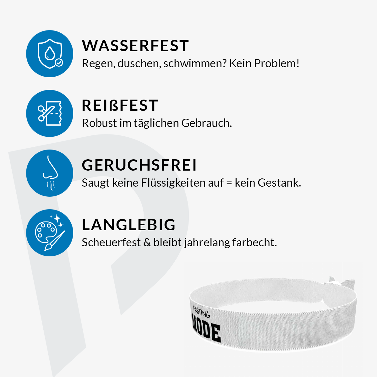Unsere bedruckten Stoffarmbänder sind dünner & qualitativer als übliche Festivalbänder! Sie sind wasser-, reiss- & abriebfest und werden von uns in Handarbeit produziert!