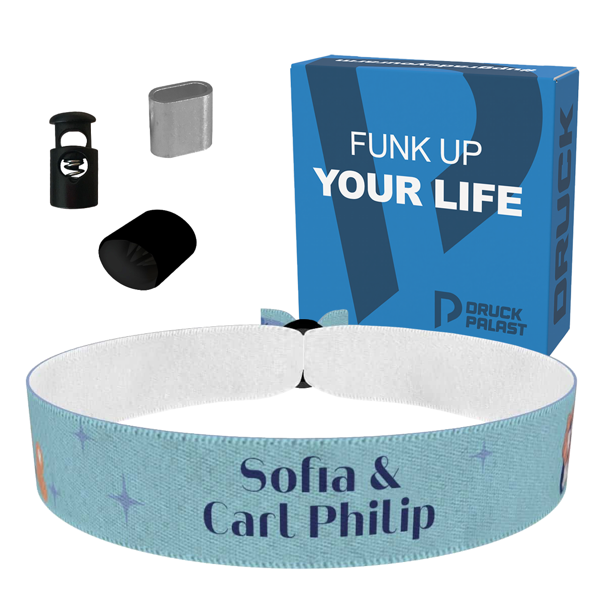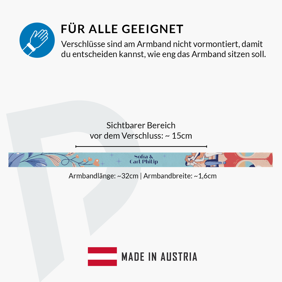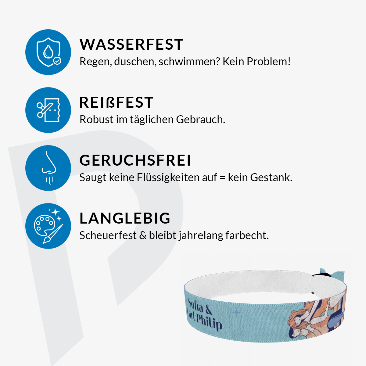 Unsere bedruckten Stoffarmbänder sind dünner & qualitativer als übliche Festivalbänder! Sie sind wasser-, reiss- & abriebfest und werden von uns in Handarbeit produziert!