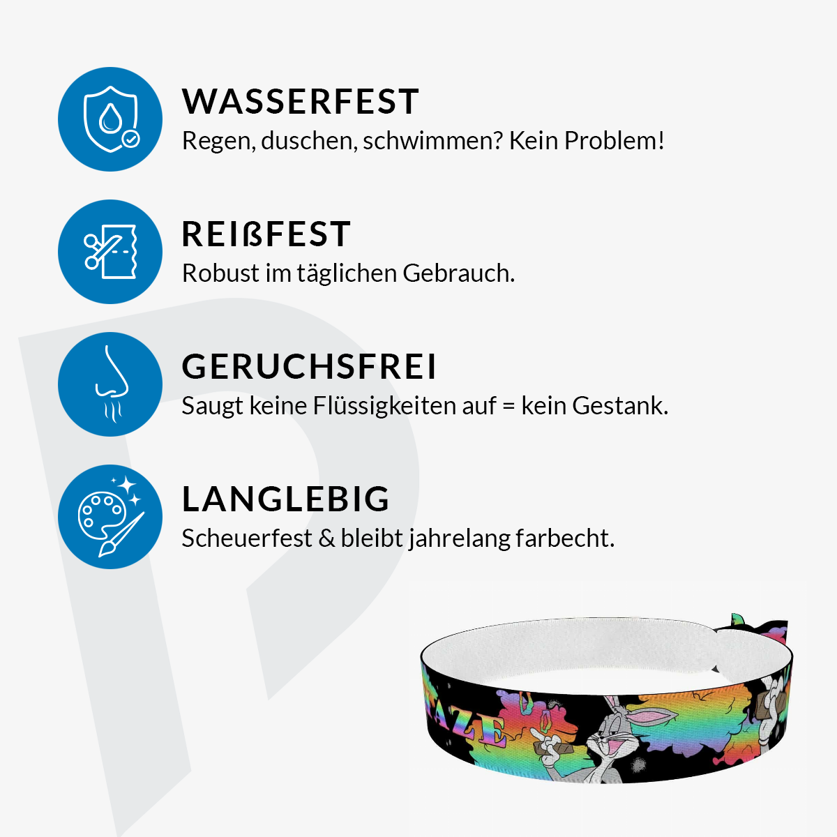 Unsere bedruckten Stoffarmbänder sind dünner & qualitativer als übliche Festivalbänder! Sie sind wasser-, reiss- & abriebfest und werden von uns in Handarbeit produziert!