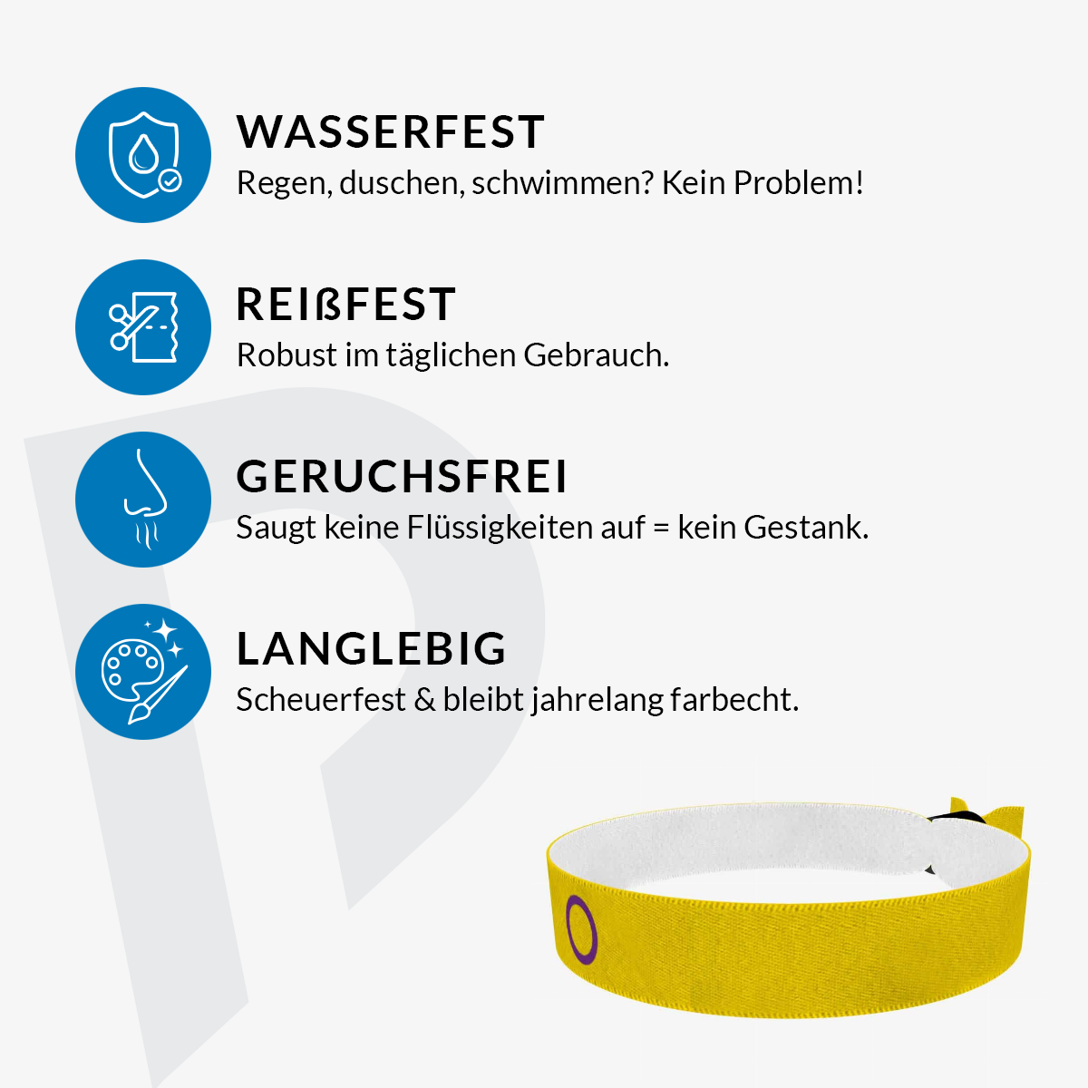 Unsere bedruckten Stoffarmbänder sind dünner & qualitativer als übliche Festivalbänder! Sie sind wasser-, reiss- & abriebfest und werden von uns in Handarbeit produziert!