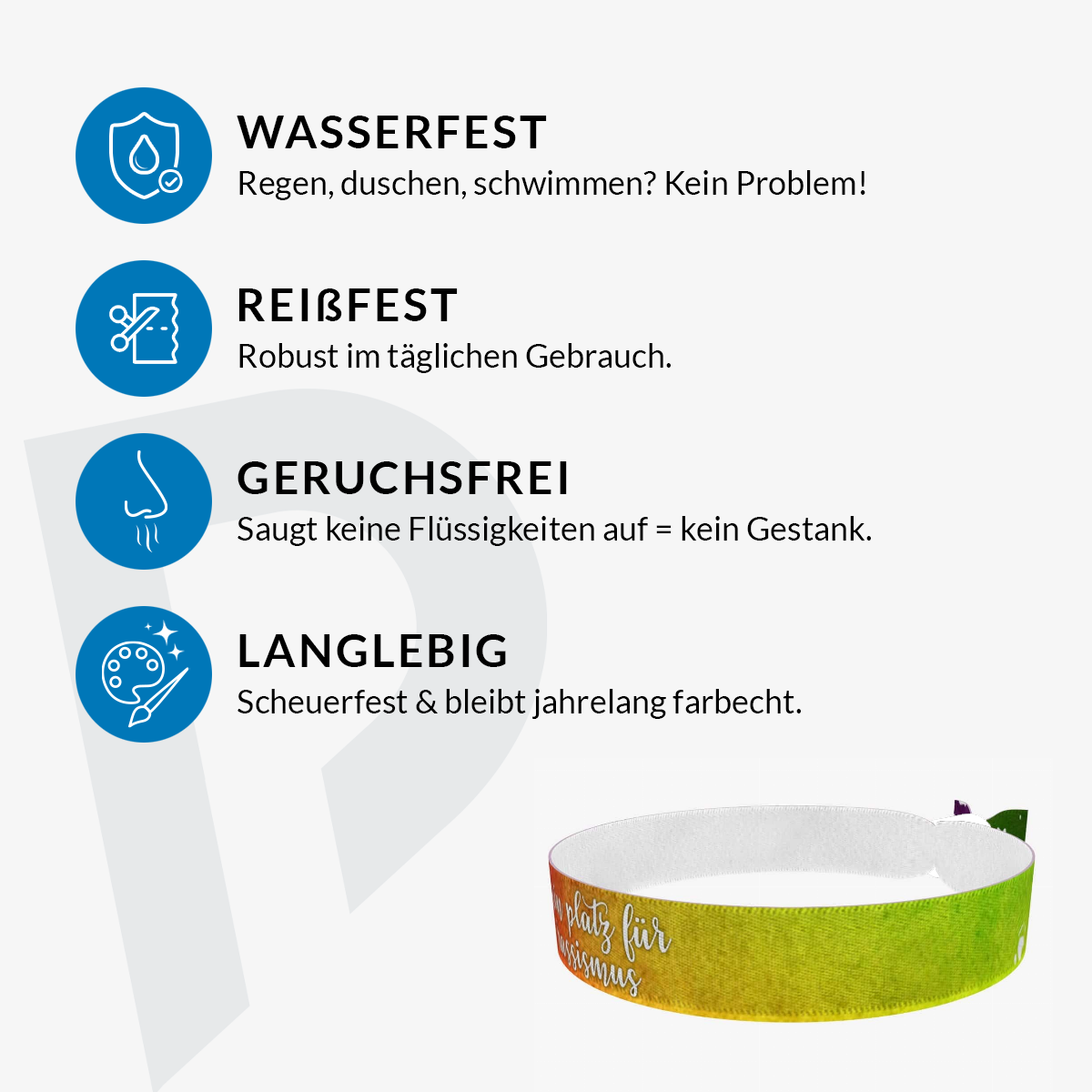 Unsere bedruckten Stoffarmbänder sind dünner & qualitativer als übliche Festivalbänder! Sie sind wasser-, reiss- & abriebfest und werden von uns in Handarbeit produziert!