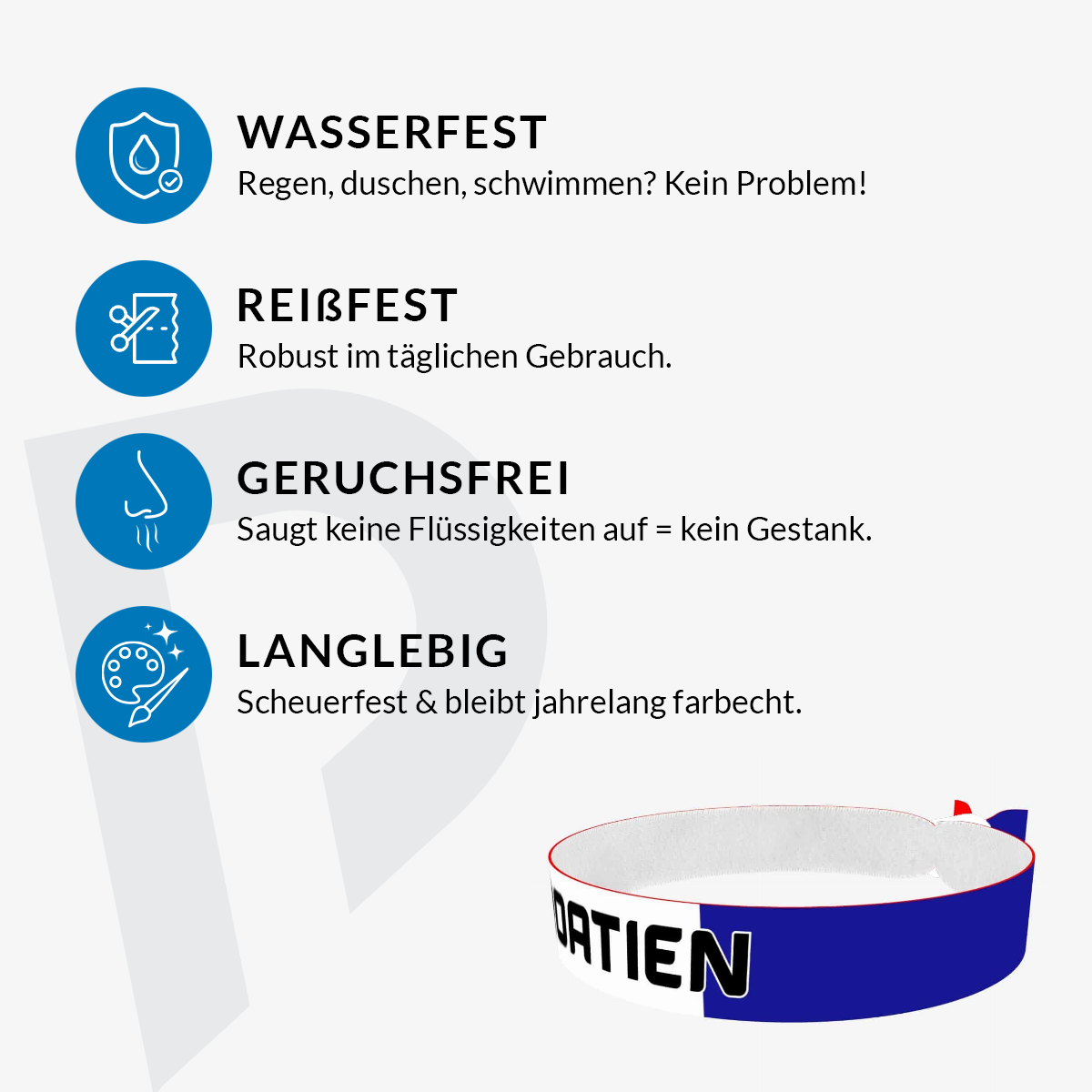Handgefertigt in Österreich, überzeugt unser Flaggenarmband durch hohe Qualität und Langlebigkeit. Es ist wasser- und abriebfest, sodass du es bei jedem Sportevent tragen kannst, ohne dir Sorgen zu machen. Das Armband für Fans ist ein tolles Geschenk für Fußballfans und passt perfekt zu deiner Kroatische Kultur.