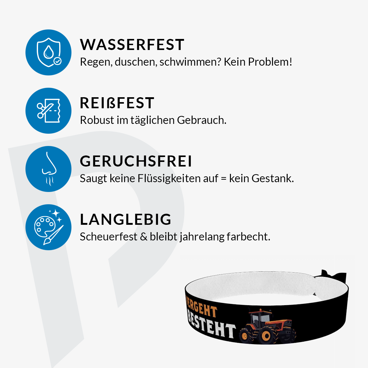 Unsere bedruckten Stoffarmbänder sind dünner & qualitativer als übliche Festivalbänder! Sie sind wasser-, reiss- & abriebfest und werden von uns in Handarbeit produziert!