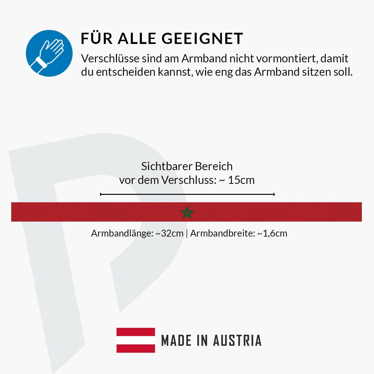 Unser Stoffarmband wird in Österreich handgefertigt und überzeugt durch hohe Qualität. Es ist robust und hält jahrelang, sodass du es bei jeder Sportveranstaltung oder Outdoor-Aktivität tragen kannst. Die marokkanischen Farben verleihen deinem Look den letzten Schliff und zeigen deinen Teamgeist.