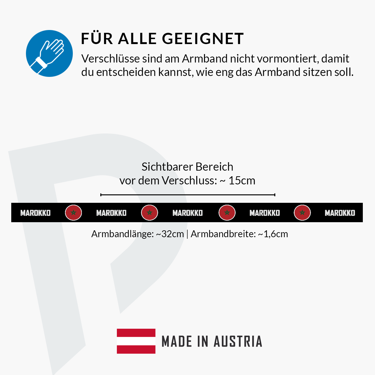 Unser marokkanisches Armband wird in Österreich hergestellt und überzeugt durch seine hohe Qualität. Es hält jahrelang, egal wie viele Festivals oder Sportevents du besuchst! Mit einem farbenfrohen, detailreichen Design bringt es die marokkanische Fahne und die marokkanischen Farben perfekt zur Geltung. Ob als Sportaccessoire oder modisches Accessoire, dieses Statement-Armband lässt dich immer gut aussehen!
