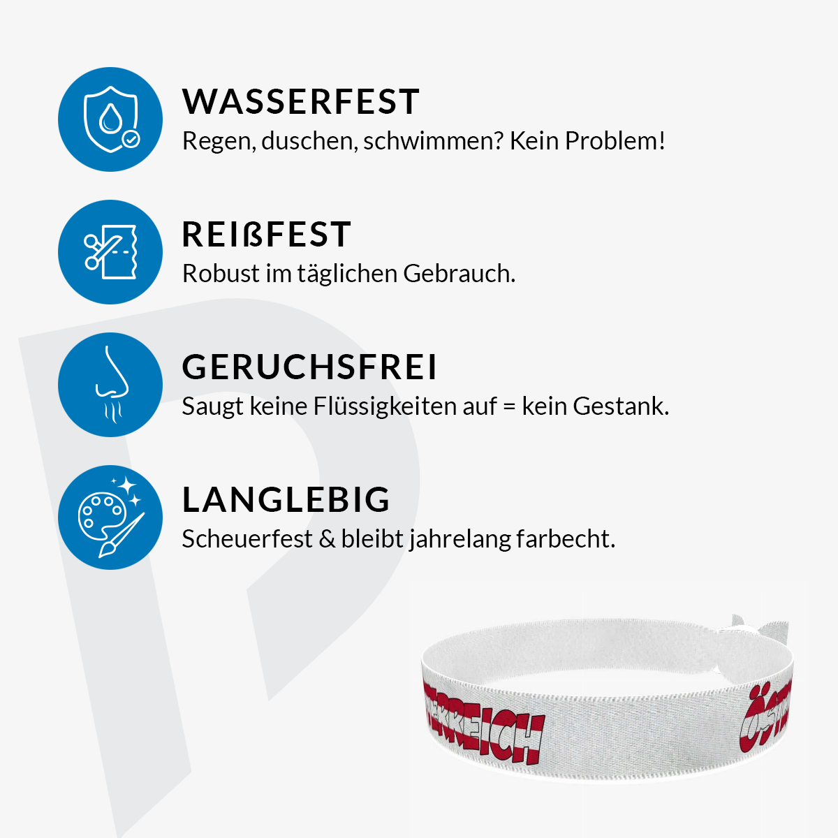 Unsere bedruckten Stoffarmbänder sind dünner & qualitativer als übliche Festivalbänder! Sie sind wasser-, reiss- & abriebfest und werden von uns in Handarbeit produziert!