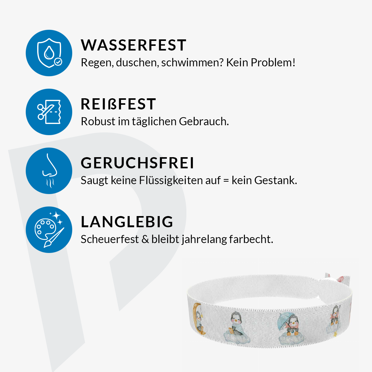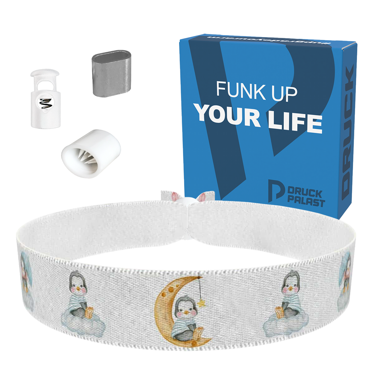 Unsere bedruckten Stoffarmbänder sind dünner & qualitativer als übliche Festivalbänder! Sie sind wasser-, reiss- & abriebfest und werden von uns in Handarbeit produziert!