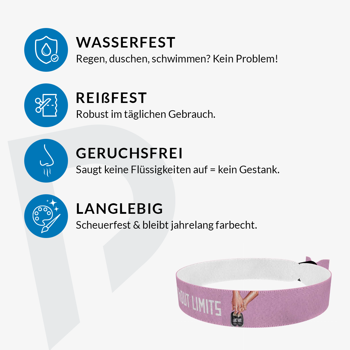 Unsere bedruckten Stoffarmbänder sind dünner & qualitativer als übliche Festivalbänder! Sie sind wasser-, reiss- & abriebfest und werden von uns in Handarbeit produziert!