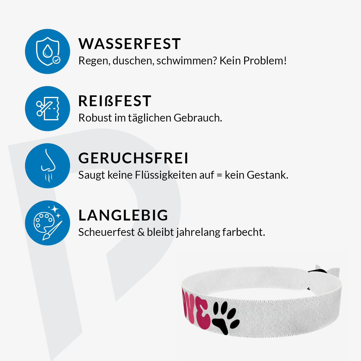 Unsere bedruckten Stoffarmbänder sind dünner & qualitativer als übliche Festivalbänder! Sie sind wasser-, reiss- & abriebfest und werden von uns in Handarbeit produziert!