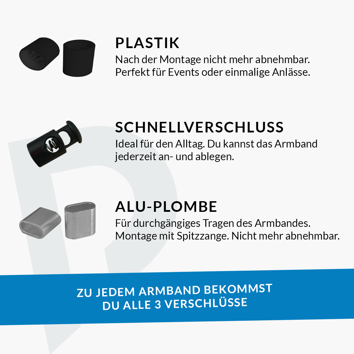 Special: Zu jedem Stoffarmband bekommst du 3 Verschlüsse: 1 x Plastik, 1 x Schnellverschluss (kann man jederzeit abnehmen und wieder rauf geben) und 1 x Metall (Spitzzange wird benötigt) – so kannst du selbst entscheiden, welchen Verschluss du auf deinem Armband haben möchtest.