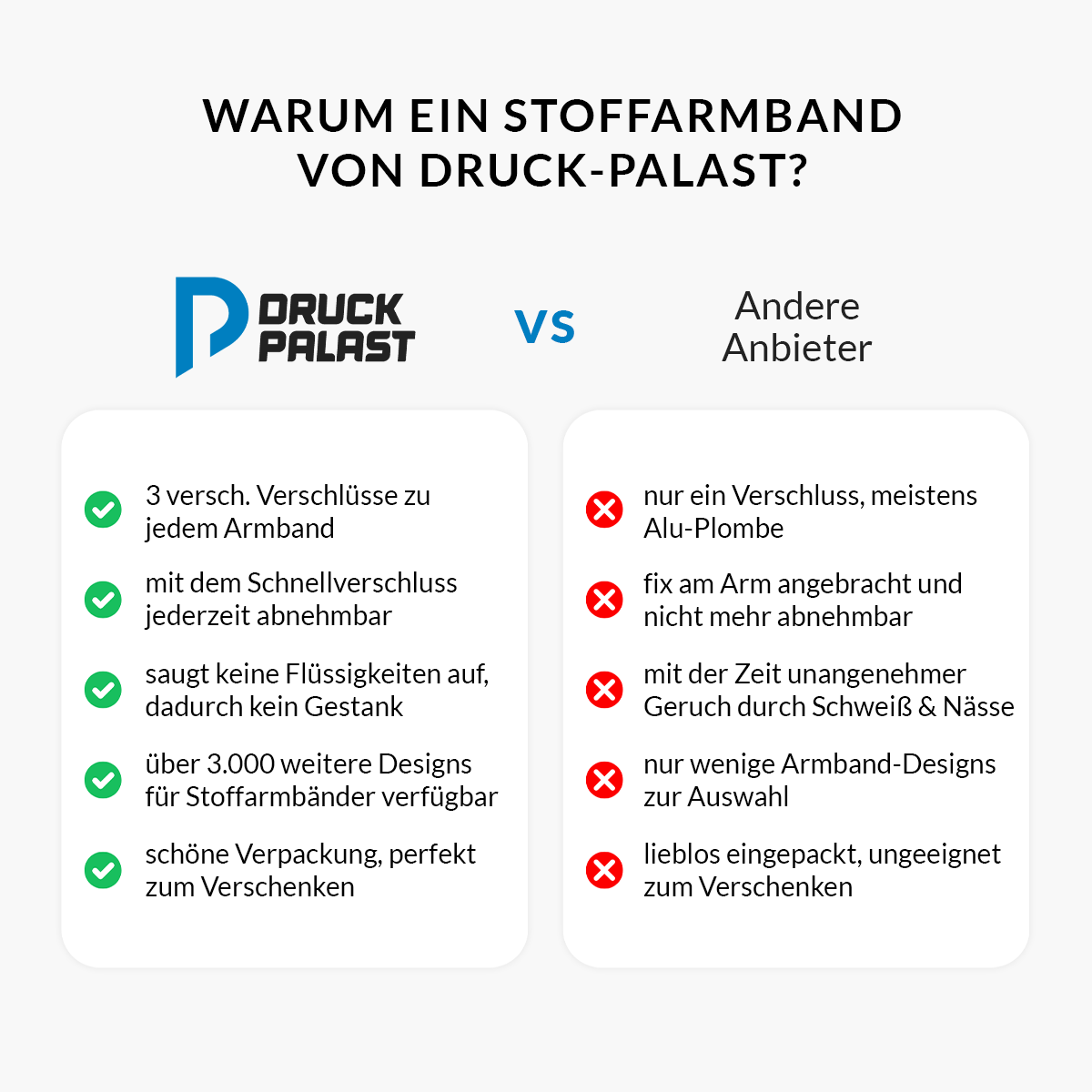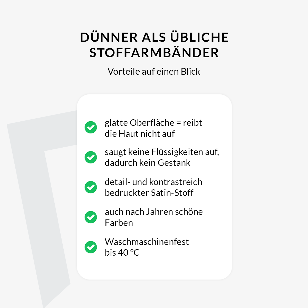 Unsere bedruckten Stoffarmbänder sind dünner & qualitativer als übliche Festivalbänder! Sie sind wasser-, reiss- & abriebfest und werden von uns in Handarbeit produziert!