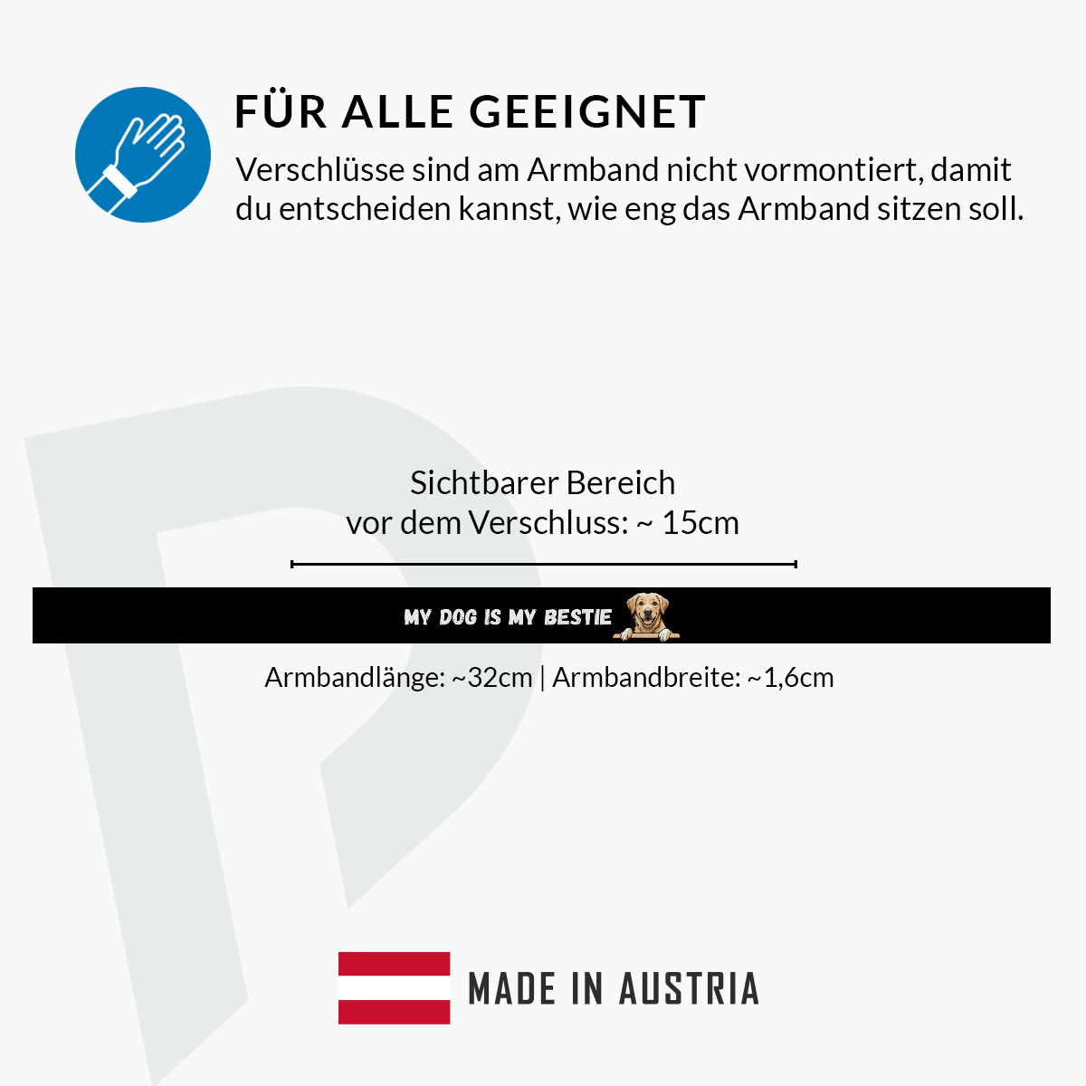 Suchst du nach einem stylischen Accessoire, das deine Liebe zu deinem Vierbeiner auf besondere Weise zum Ausdruck bringt? Dann ist das Stoffarmband My Dog is My Bestie für Hundeliebhaber genau das Richtige für dich! Dieses hochwertige Stoffarmband, das in Österreich hergestellt wird, ist nicht nur ein modisches Highlight, sondern auch eine schöne Erinnerung an deinen Hund.
