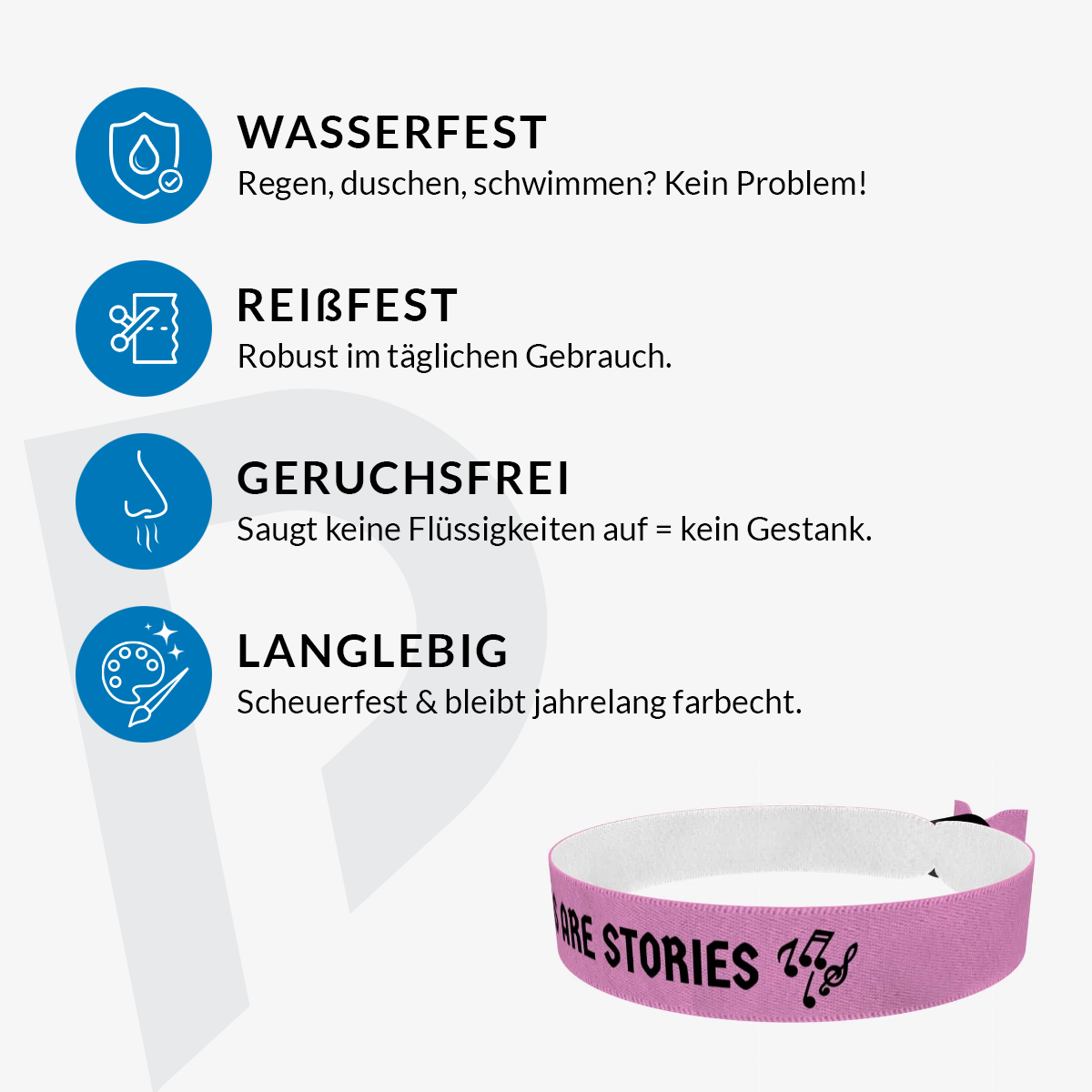 Unsere bedruckten Stoffarmbänder sind dünner & qualitativer als übliche Festivalbänder! Sie sind wasser-, reiss- & abriebfest und werden von uns in Handarbeit produziert!