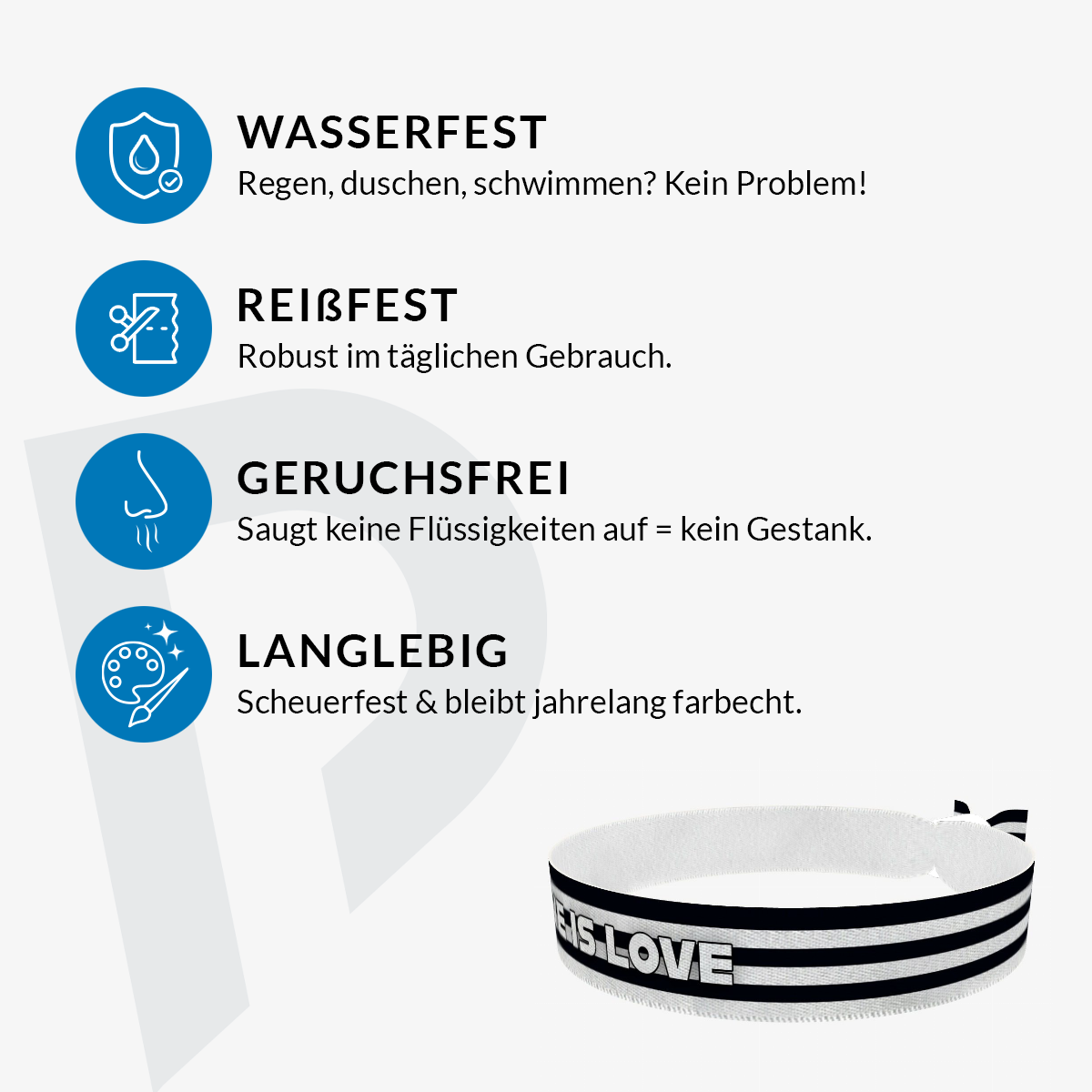 Unsere bedruckten Stoffarmbänder sind dünner & qualitativer als übliche Festivalbänder! Sie sind wasser-, reiss- & abriebfest und werden von uns in Handarbeit produziert!