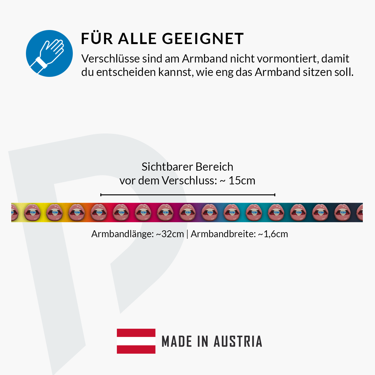 Unsere bedruckten Stoffarmbänder sind dünner & qualitativer als übliche Festivalbänder! Sie sind wasser-, reiss- & abriebfest und werden von uns in Handarbeit produziert!