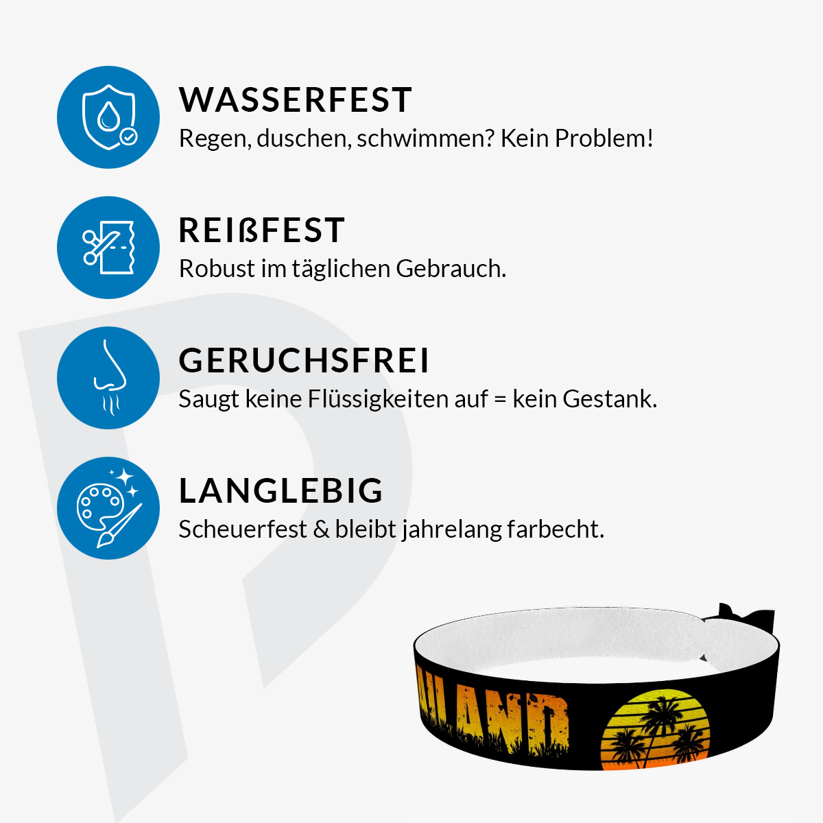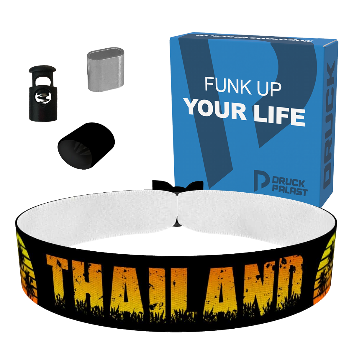 Unsere bedruckten Stoffarmbänder sind dünner & qualitativer als übliche Festivalbänder! Sie sind wasser-, reiss- & abriebfest und werden von uns in Handarbeit produziert!