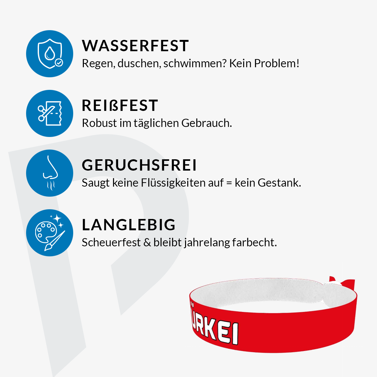 Unsere bedruckten Stoffarmbänder sind dünner & qualitativer als übliche Festivalbänder! Sie sind wasser-, reiss- & abriebfest und werden von uns in Handarbeit produziert!