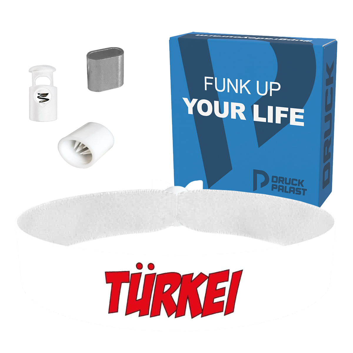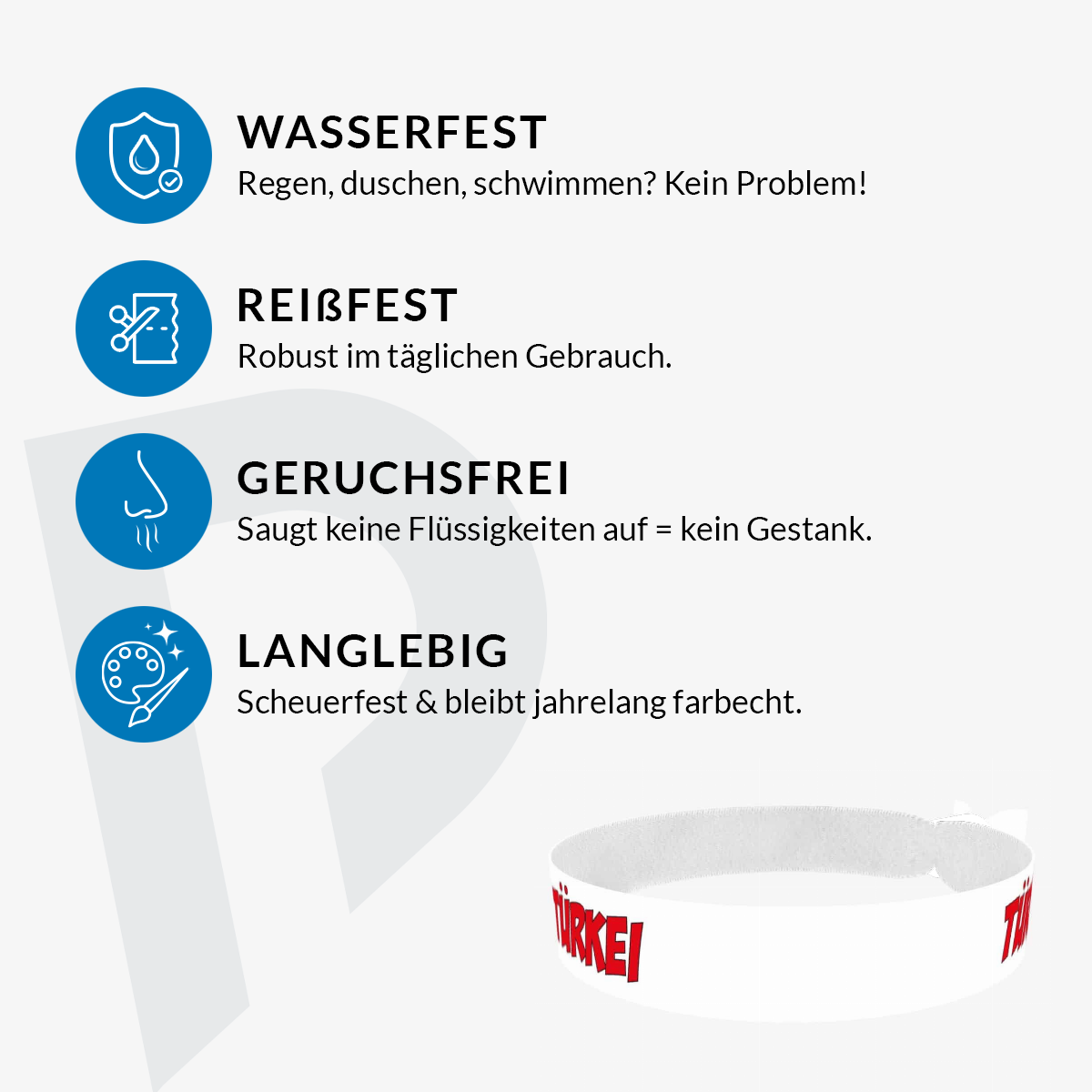 Unsere bedruckten Stoffarmbänder sind dünner & qualitativer als übliche Festivalbänder! Sie sind wasser-, reiss- & abriebfest und werden von uns in Handarbeit produziert!
