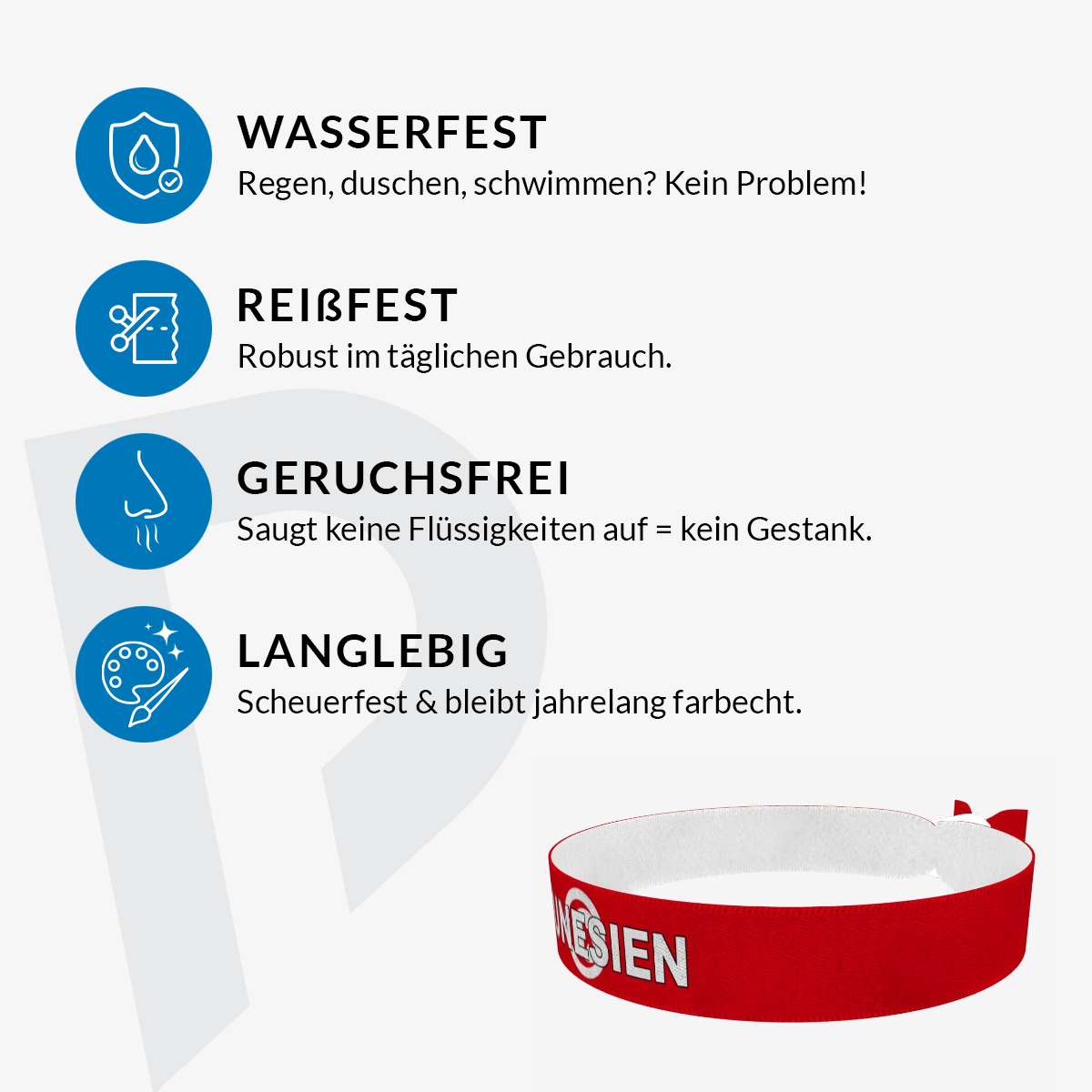Unsere bedruckten Stoffarmbänder sind dünner & qualitativer als übliche Festivalbänder! Sie sind wasser-, reiss- & abriebfest und werden von uns in Handarbeit produziert!