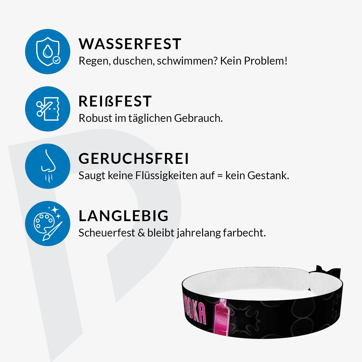 Unsere bedruckten Stoffarmbänder sind dünner & qualitativer als übliche Festivalbänder! Sie sind wasser-, reiss- & abriebfest und werden von uns in Handarbeit produziert!