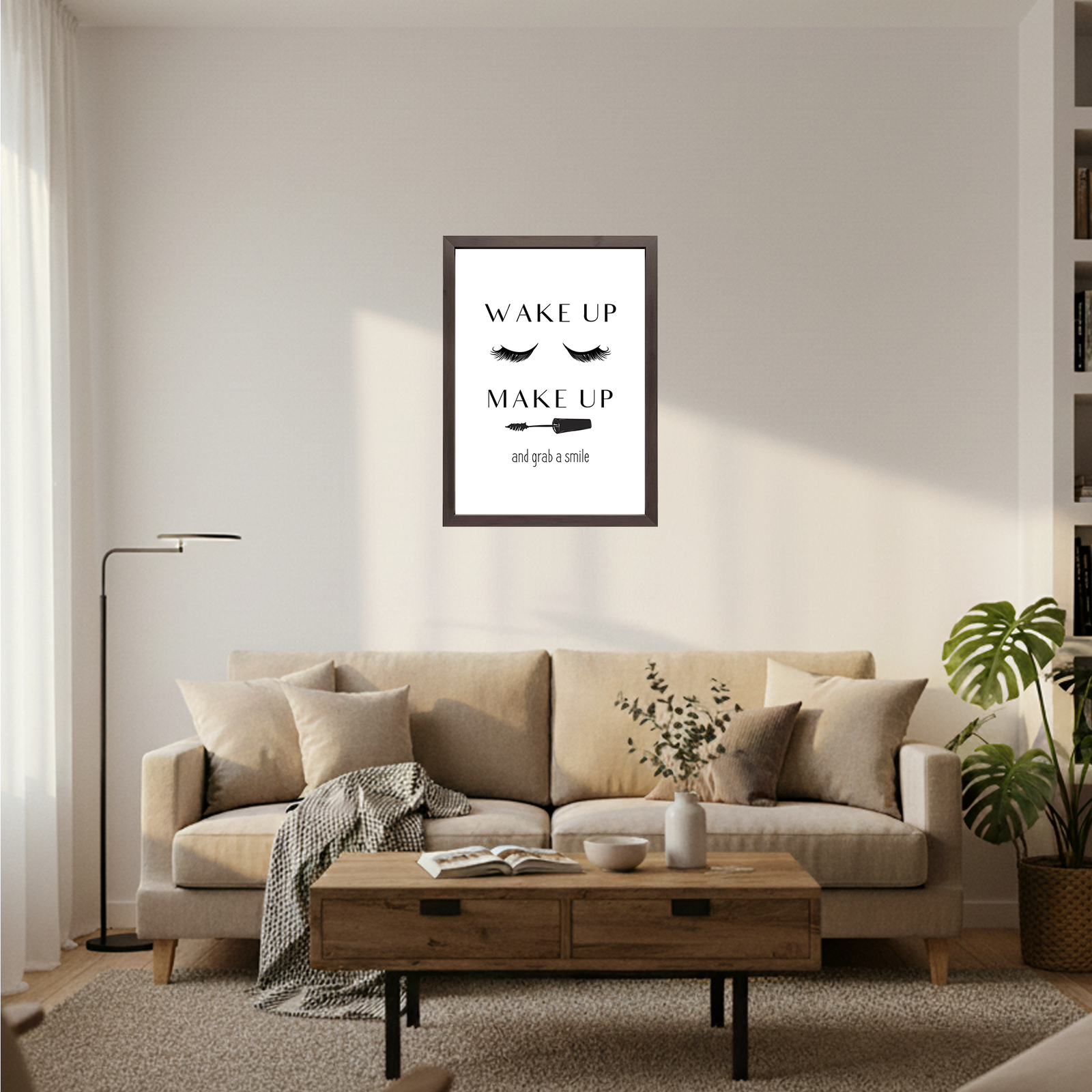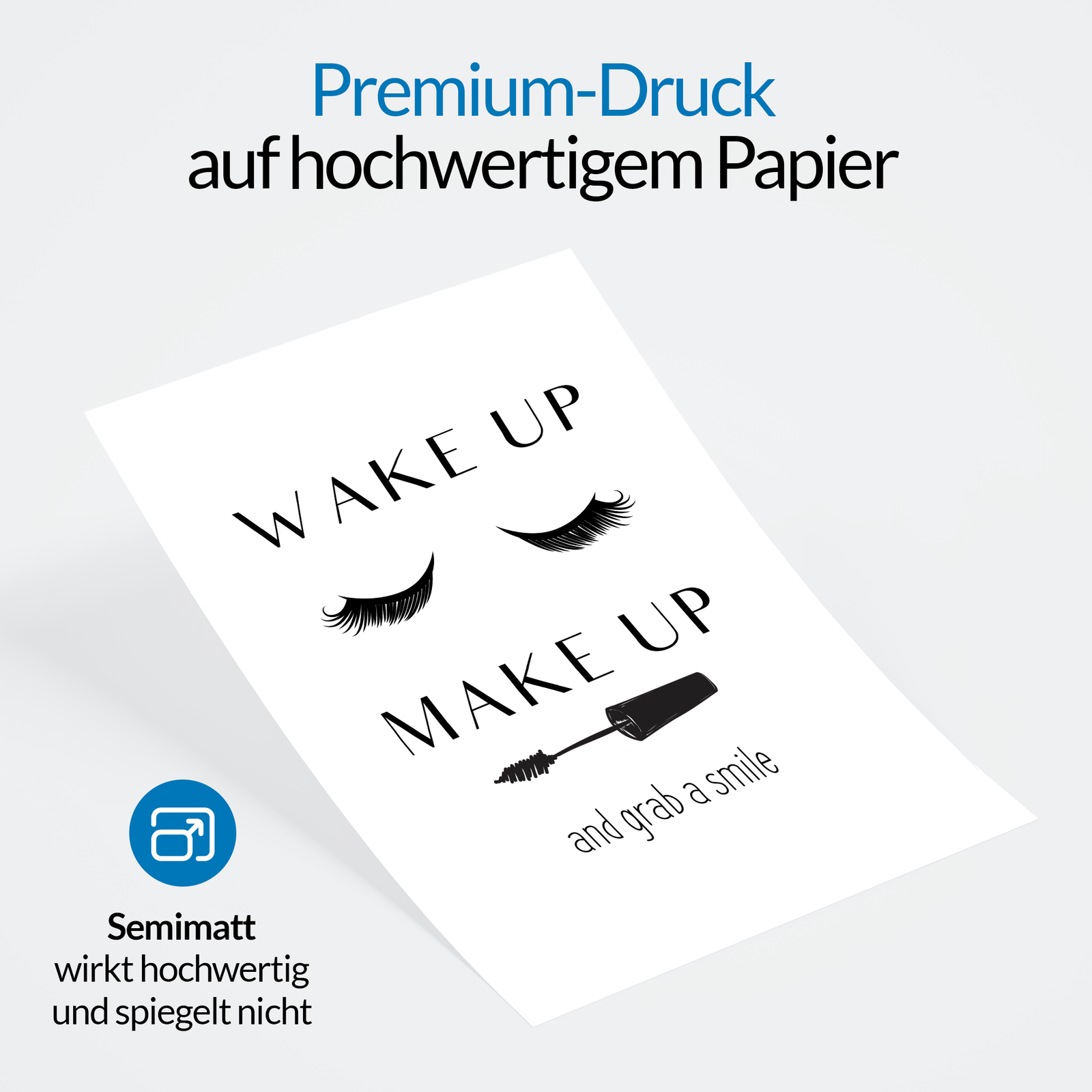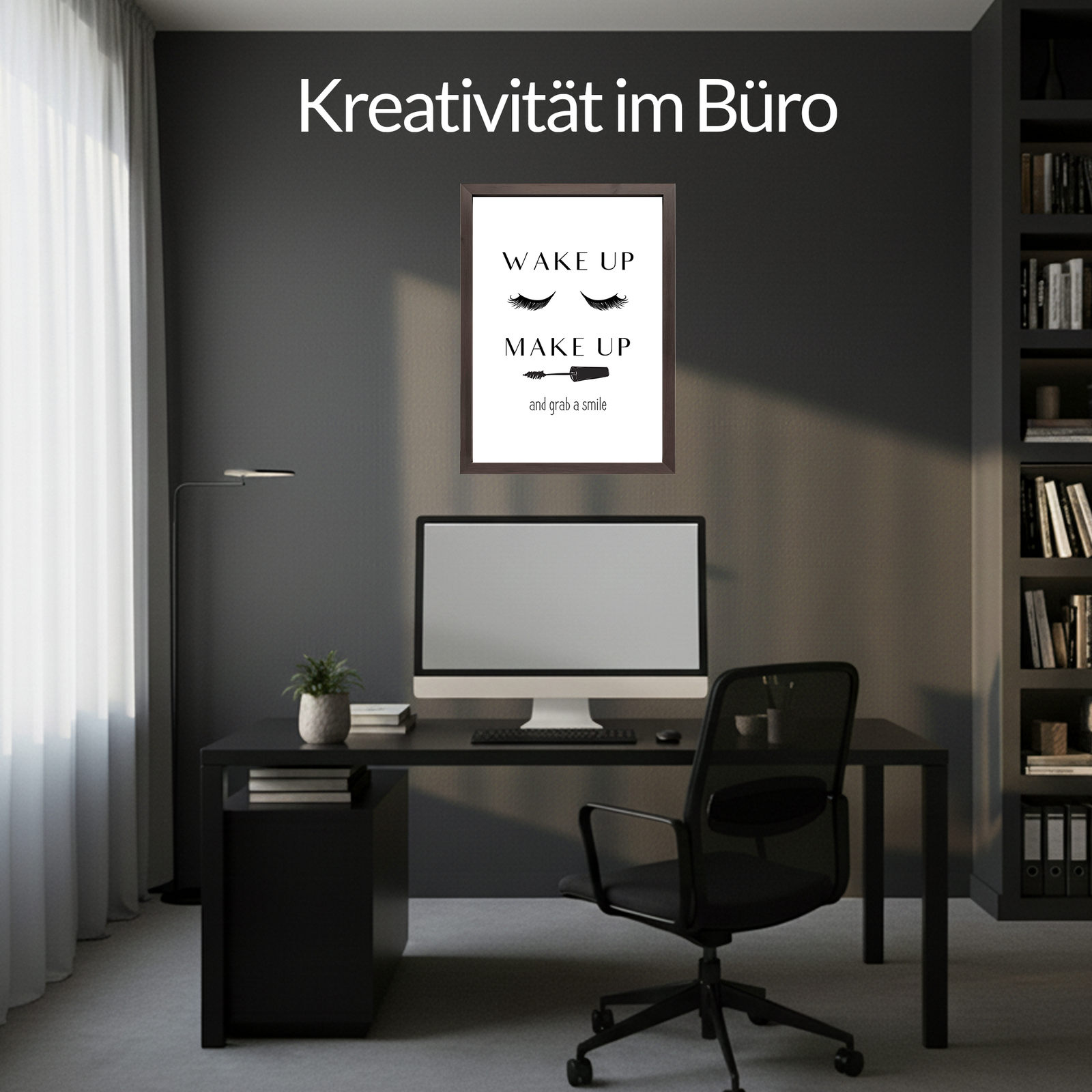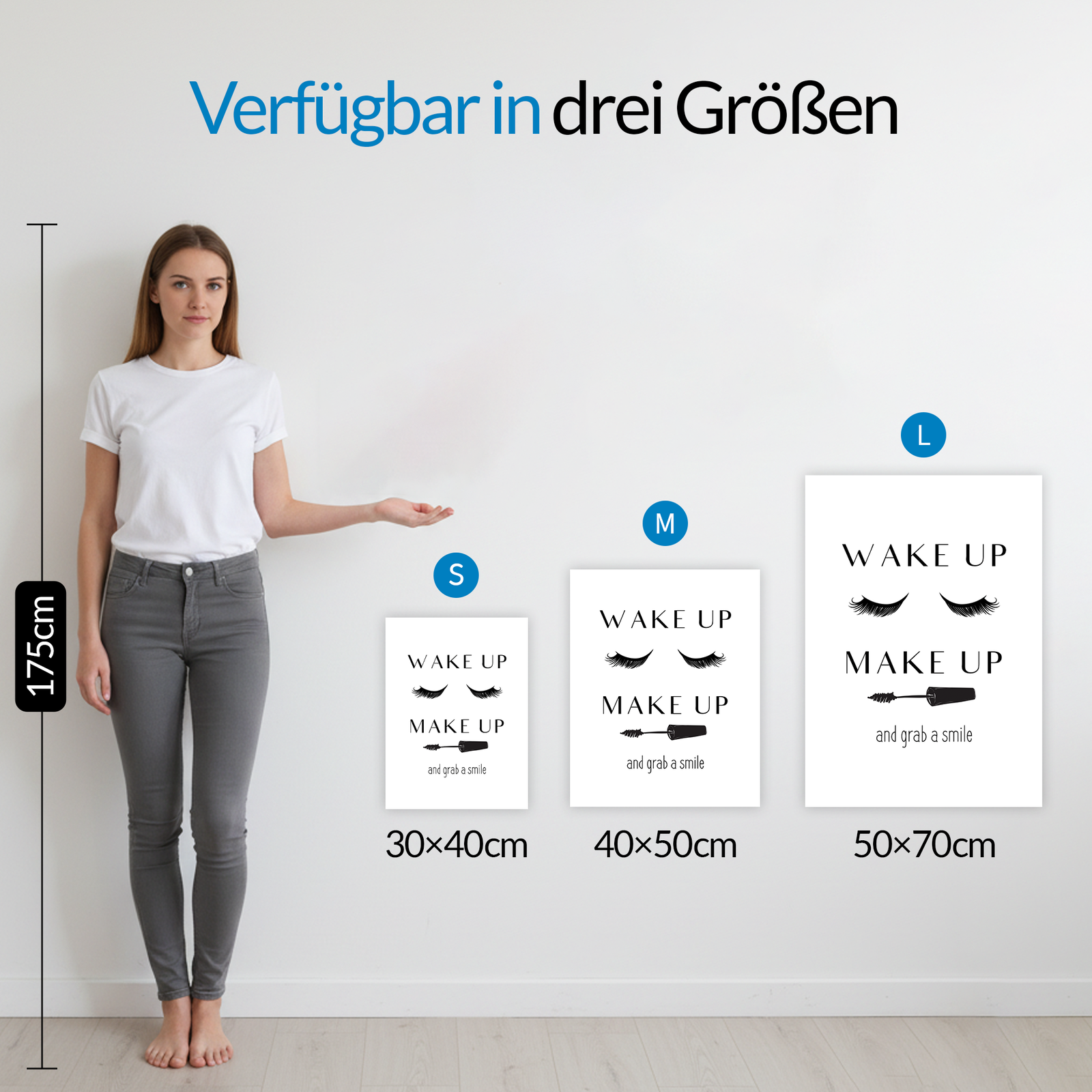 Dein hochwertiges Wandbild: du erhältst das witzige ‚Wake Up. Make Up and grab a Smile Poster‘, das nicht nur durch seine kreative Gestaltung, sondern auch durch seine positive Botschaft besticht. Mit minimalistischer Schrift und charmanten Illustrationen von Wimpern und Mascara auf einem klaren weißen Hintergrund bringt dieses Poster eine fröhliche Atmosphäre in jeden Raum. Egal, ob du es im Wohnzimmer, Schlafzimmer, Büro oder sogar im Kinderzimmer aufhängst – dieses Poster sorgt überall für gute Laune und inspiriert dich jeden Tag aufs Neue.