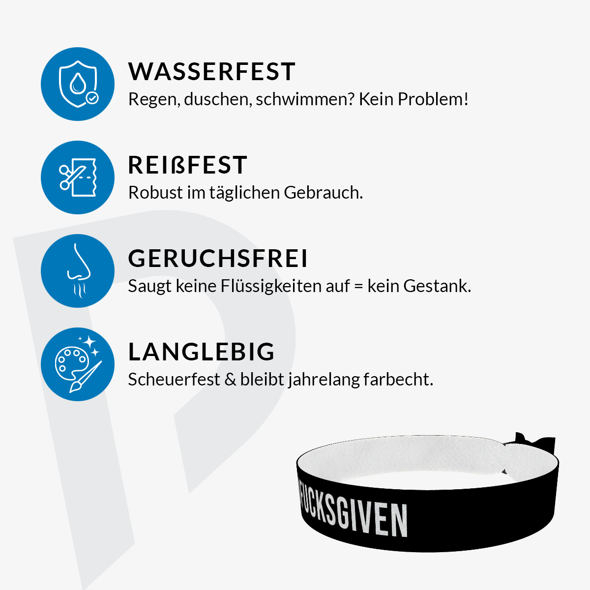 Unsere bedruckten Stoffarmbänder sind dünner & qualitativer als übliche Festivalbänder! Sie sind wasser-, reiss- & abriebfest und werden von uns in Handarbeit produziert!